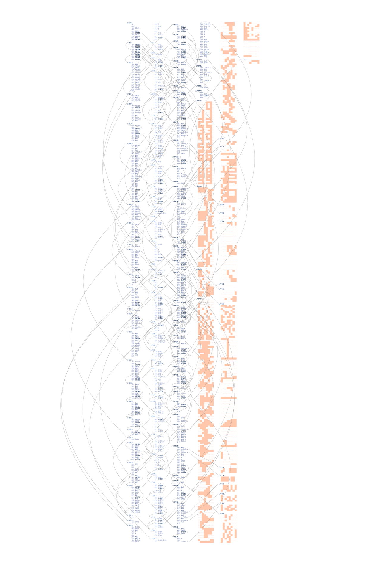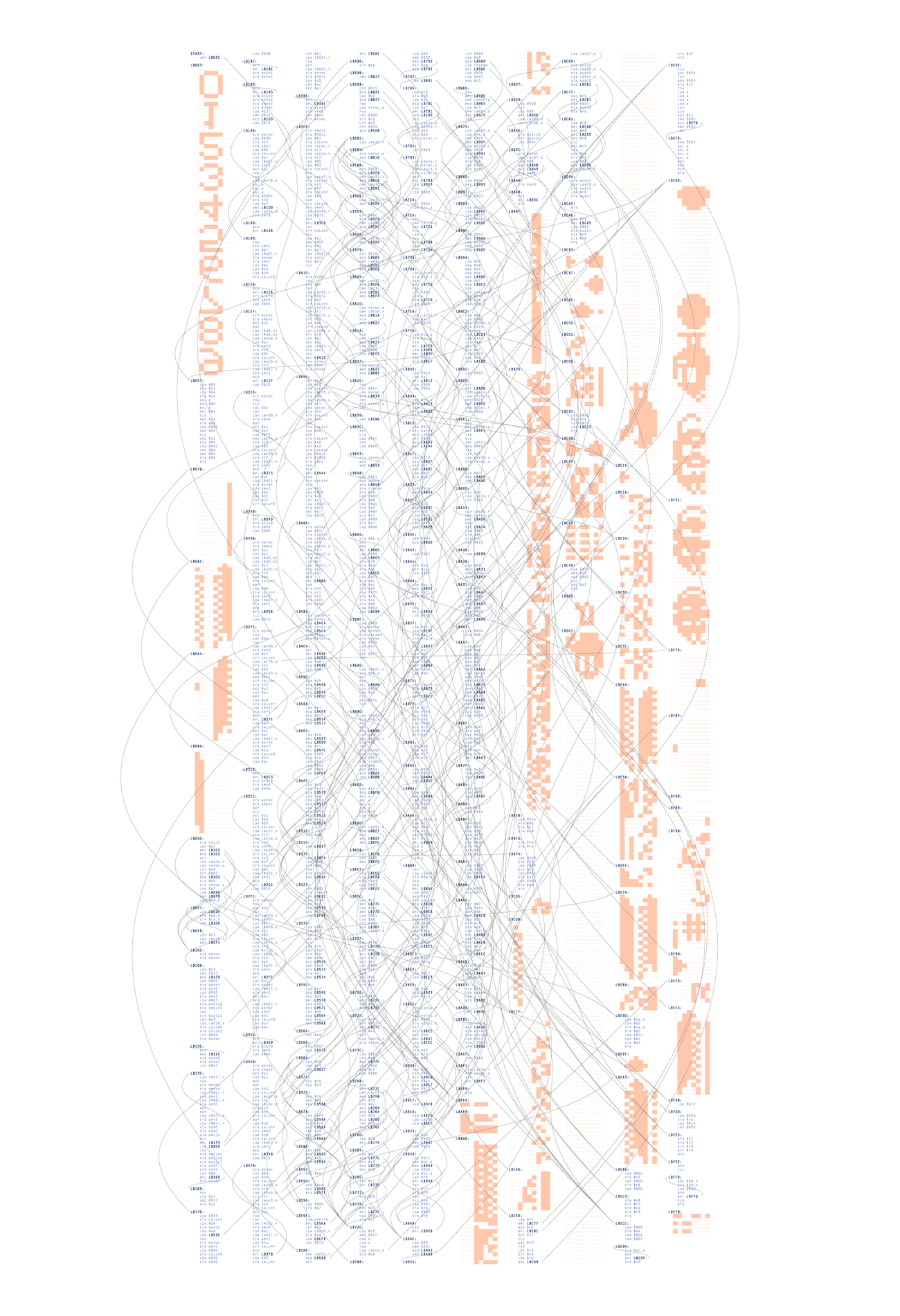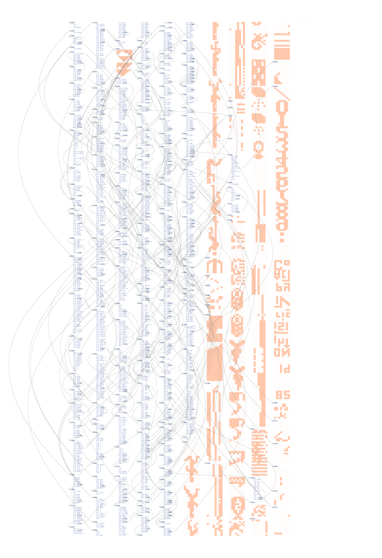 Like any other game console, Atari 2600 cartridges contained executable code also commingled with data. This lists the code as columns of assembly language. Most of it is math or conditional statements (if x is true, go to y), so each time there's "go to" a curve is drawn from that point to its destination. When a byte of data (as opposed to code) is found in the cartridge, it is shown as an orange row: a solid block for a "1" or a dot for a "0". The row is eight elements long, representing a whole byte. This usually means that the images can be seen in their entirety when a series of bytes are shown as rows. The images were often stored upside-down as a programming method. The original version of these images are a series of 13 x 19 inch prints where you can actually read the individual bits of text. I modified a version of distella to produce disassembled text output in the format that I wanted, and then used Processing to write a second program that creates the image of the output. << BEN FRY | posted August 2005, updated July 2025 |