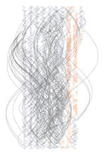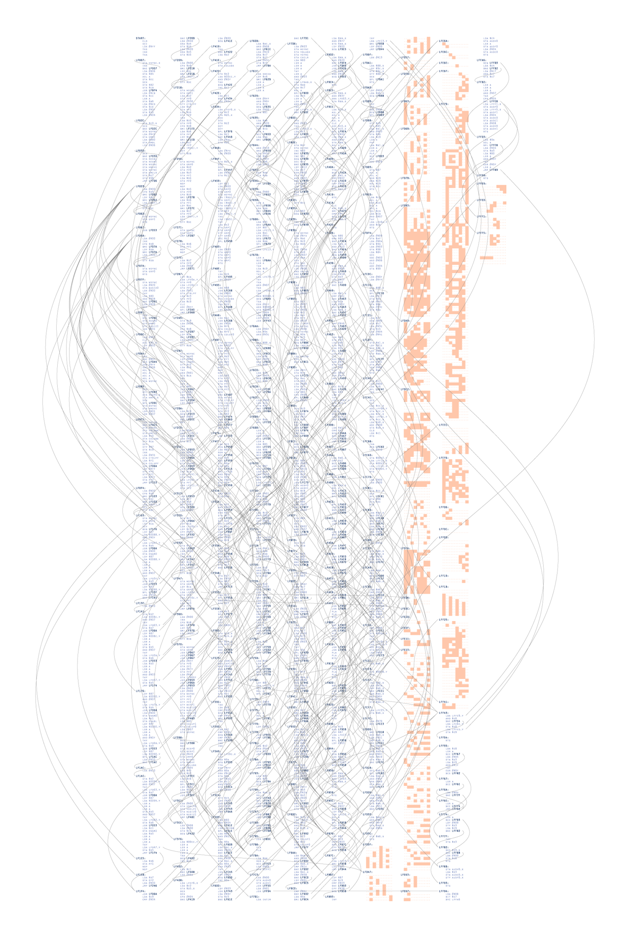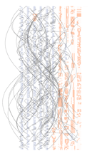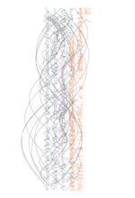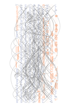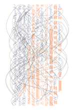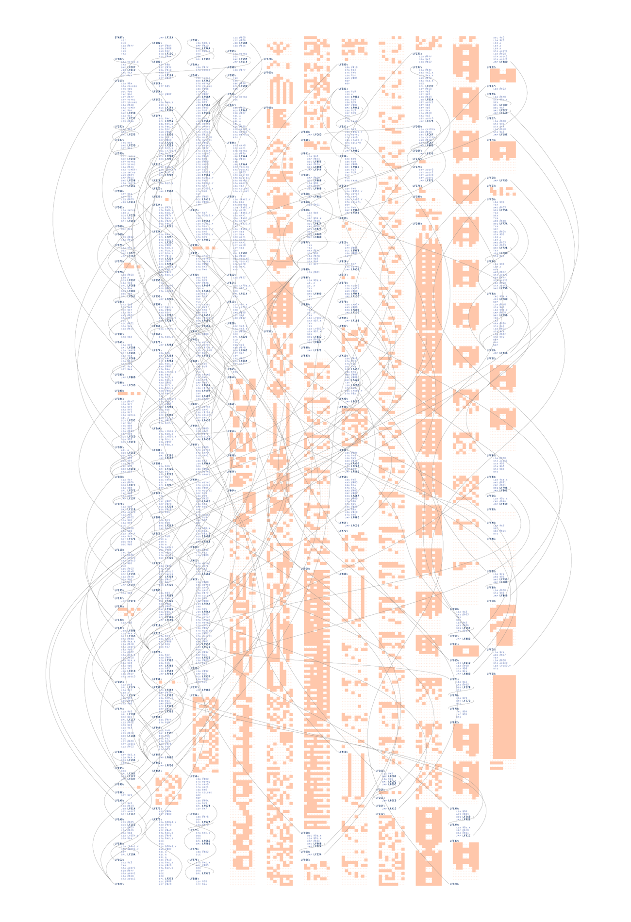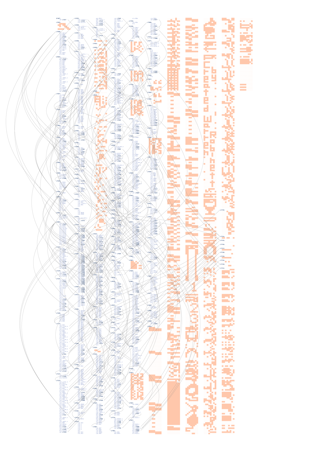 Like any other game console, Atari 2600 cartridges contained executable code also commingled with data. This lists the code as columns of assembly language. Most of it is math or conditional statements (if x is true, go to y), so each time there's "go to" a curve is drawn from that point to its destination. When a byte of data (as opposed to code) is found in the cartridge, it is shown as an orange row: a solid block for a "1" or a dot for a "0". The row is eight elements long, representing a whole byte. This usually means that the images can be seen in their entirety when a series of bytes are shown as rows. The images were often stored upside-down as a programming method. The original version of these images are a series of 13 x 19 inch prints where you can actually read the individual bits of text. I modified a version of distella to produce disassembled text output in the format that I wanted, and then used Processing to write a second program that creates the image of the output. << BEN FRY | posted August 2005, updated July 2025 |