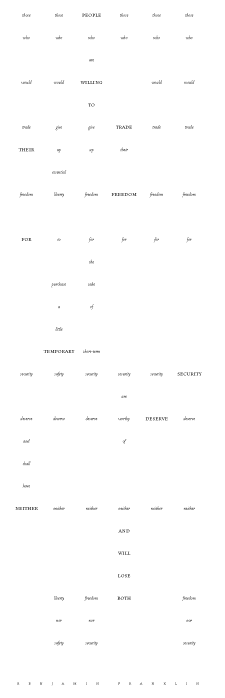 a poster for the wall of john ashcroft's office shows several variations of a quote from benjamin franklin (also cited to thomas jefferson) "people willing to trade their freedom for temporary security deserve neither and will lose both" for passover seder in 2002, my roommate asked that everyone bring something related to the theme of freedom, so i made this print. (download printable version in pdf format)