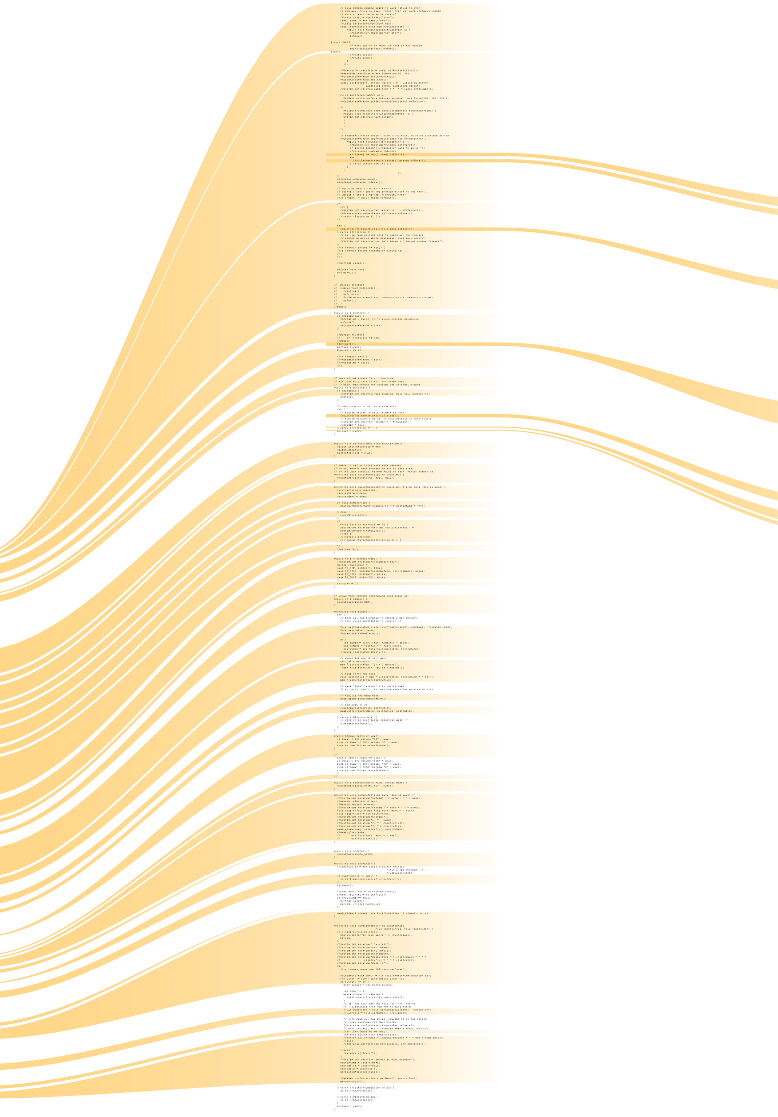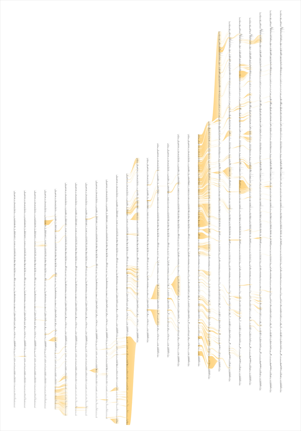 revisionist Visualizing the evolution of software projects While it's obvious that the code in a software project changes over time, less obvious is the nature of how the code how individual changes have taken place in a broader context. Projects are typically structured as a collection of files that are added, removed, and reorganized throughout the course of development. The contents of the individual files are modified, line by line or in large pieces for every fix and feature. (Click thumbnails for a larger image. Note that the actual prints of these projects are 32 inches wide and 50 inches tall, so the web is a terrible format for them, and contradicts the goal of seeing all the changes at once). The revisionist software generates an image that shows the evolution of the structure and content of the Processing project over time, from its initial inception through forty releases. The experiment consists of large-format printed pieces to depict broader changes over time. One image shows an overall picture of the changes, with each column representing one version of the software. Lines are drawn between the columns to connect lines that have changed. Notable changes can be seen for the removal of one large file (bottom, middle), and the later addition of a new file (top, right), or a spike in activity (about two-thirds to the right) coinciding with a push for the initial alpha release of the project. The second image shows a detail of the image, zoomed 13x to make the text of one portion of a column legible. While the method of depicting changes between versions of a file is not new, the representation of many versions in a single instance is less conventional. The result is a depiction of the organic process in which even the smallest pieces of software code become mature through the course of its development, as they are passed between developers, revisited for later refinement, merged, removed, and simplified. This project was created as part of my "Visually Deconstructing Code" series shown in the Ars Electronica 2003 CODE Exhibition. The series was made up of several short sketch projects done in about two days to one week apiece. << ben fry | summer 2003, last updated november 2003 |